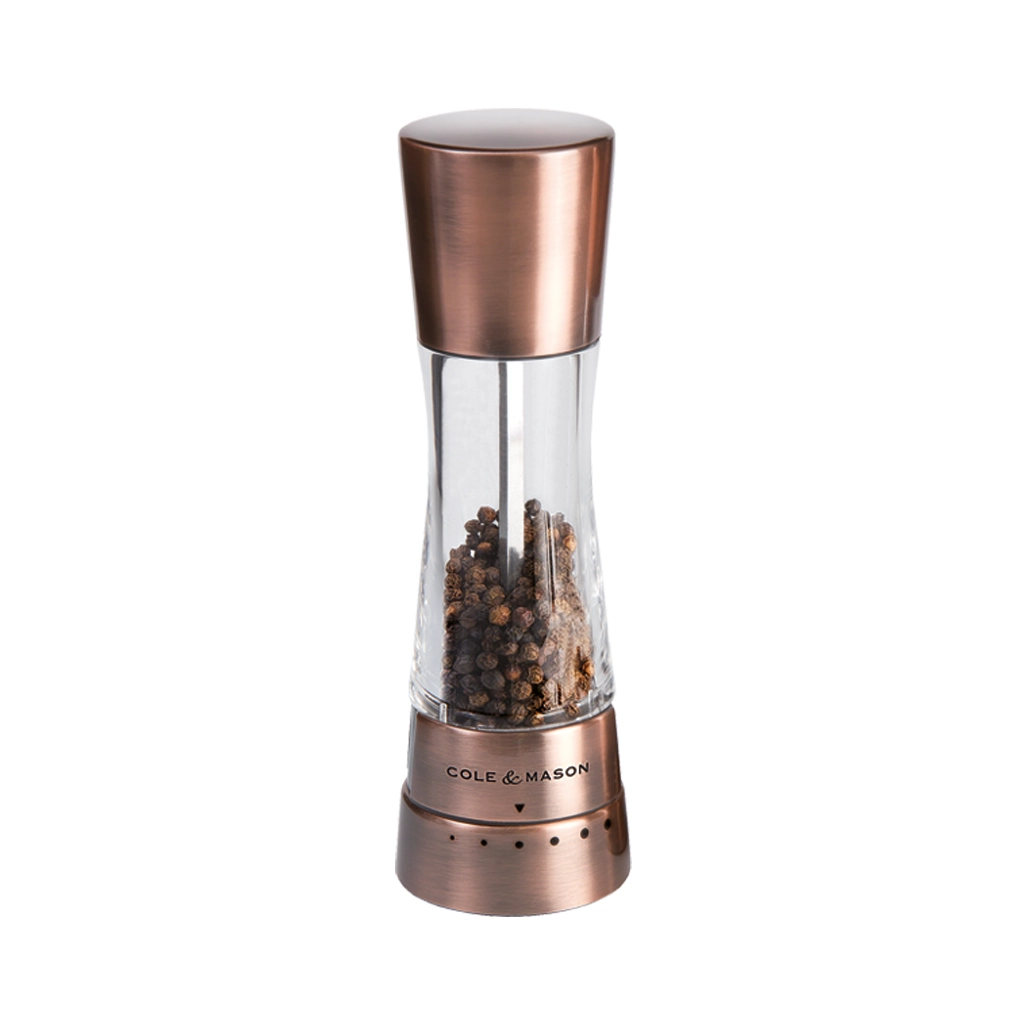 Die Pfeffermühle Derwent in Kupfer ist 19 cm gross und verfügt über Stufen von Mahlgraden, die es ermöglichen, den gewünschten Mahlgrad für den Pfeffer einfach einzustellen.