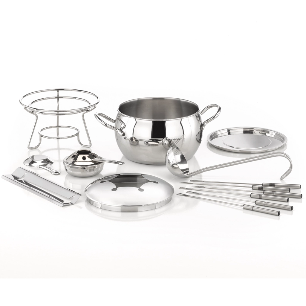 Komplettset für Fondue und Feuerzangenbowle inkl.:1 Topf1 Rechaud (nicht mit den Portionendosen kompatibel)1 Spritzschutz1 Untersetzer1 Schöpfkelle1 Feuerzange1 Pastenbrenner6 Fonduegabeln (mit Kennzeichnung)