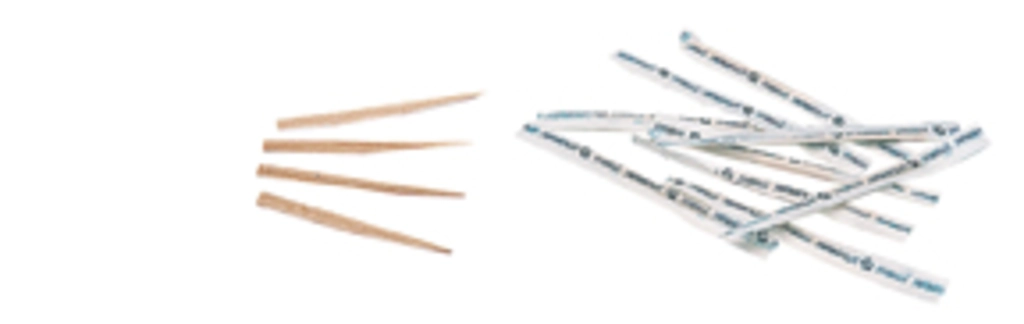V-Form, schont das Zahnfleisch, Medizinal-Zahnstocher in Keilform, einzeln in Cellophan-Hülle, mit Pfefferminz-Geschmack, einseitig gespitzt