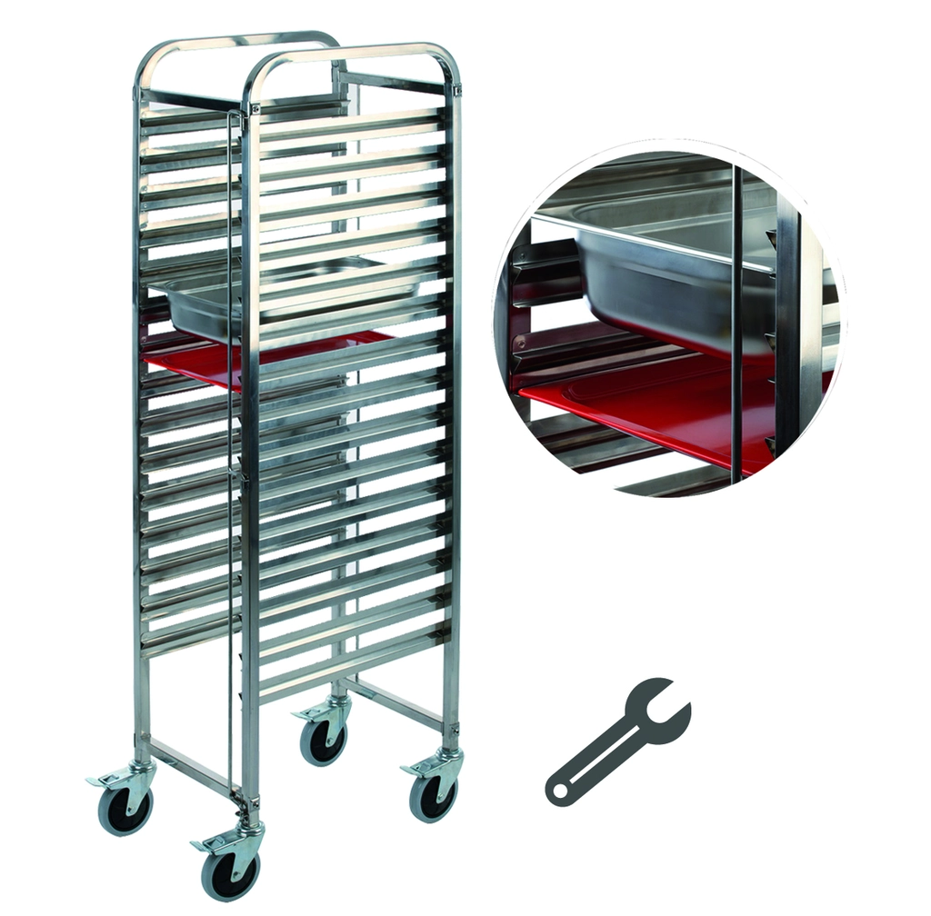 Mit 15 Doppelaufleschienen zum Transport von bis zu 30 GN-Tabletts GN1/2 oder 15 GN-Bleche bis GN 1/1, mit Transportsicherung. Abstand: 7.5 cm, 4 Lenkrollen 12.5 cm Ø, 4 Feststeller SelbstmonteMaximale Trlast 100 kg